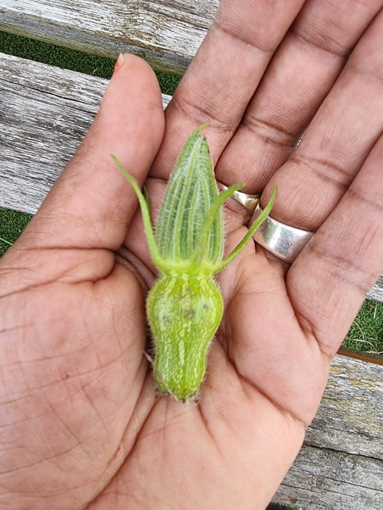 My very first fruit must have been disturbed by something because I arrived at the plot to see it lying on the ground. Eventually, I started to see little squash-shaped fruit gaining size.