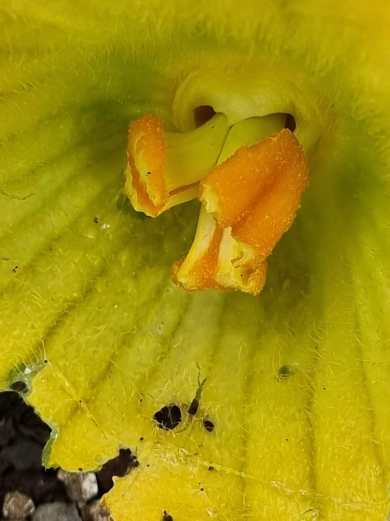 By the end of July, I was starting to see a lot of action under there. There were lots and lots of flowers and the excitement began to bubble up. Then it was time for the month’s lesson. At first, my flowers never developed into anything so I did a bit of reading. There are male and female flowers on a squash vine. Often the male flowers appear much sooner than the female ones, so there is nothing to fertilise. The male flower is a beautiful yellow bloom and the female flower has a fruit which needs to be pollinated. It’s often necessary to do this manually if they don’t do it themselves.
