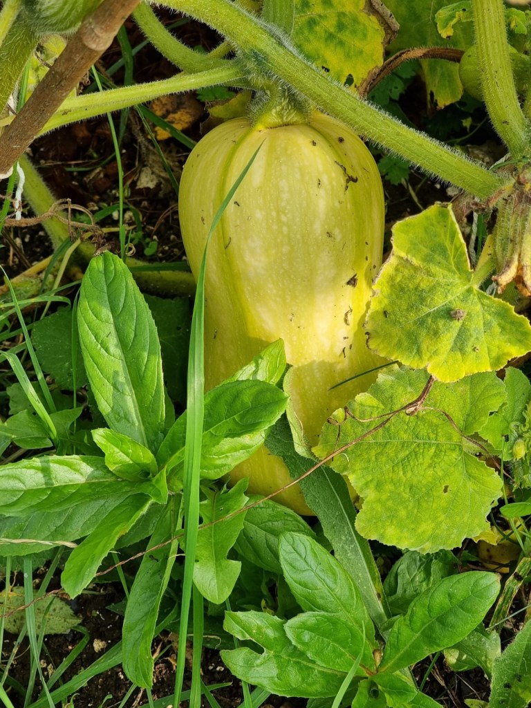 I was over the moon to see that the squash had developed into proper-sized fruit and in fact still needed a week or so to mature. Google and various plant books told me that the squash isn’t ready to harvest until the stem is dry and cracked. Mine were still green at this point so I had to wait a little longer, which was fine by me – my biggest dread was that everything would ripen and rot while I was away.