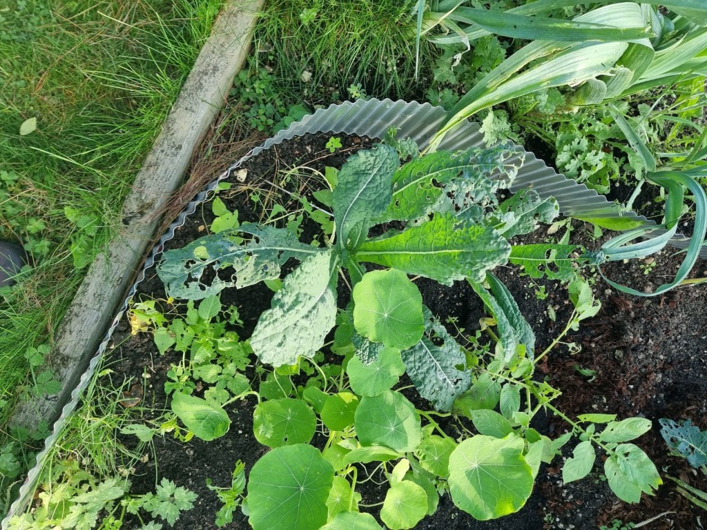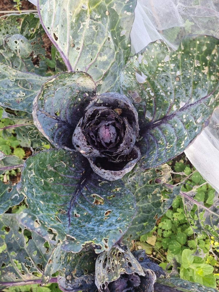 Kale – on one of my plot visits I met one of my allotment neighbours, Rose. She very kindly gave me a few kale plants which I planted under my mesh umbrella. These yielded a few tasty leaves which I was taking on a cut-and-come-again basis into the winter.